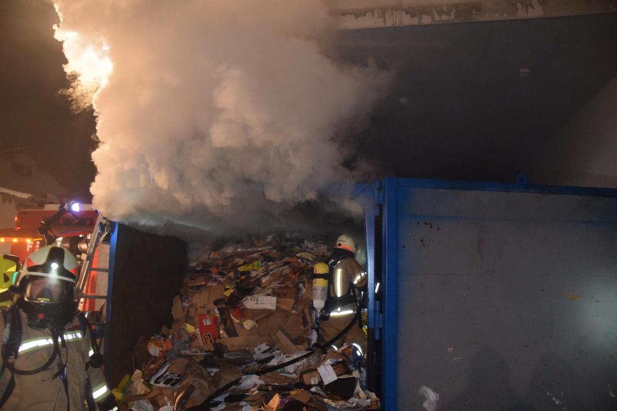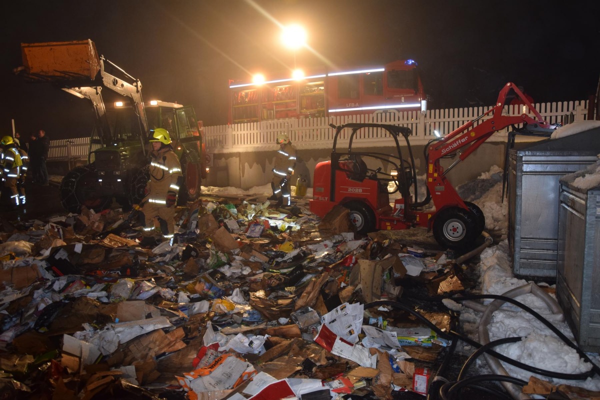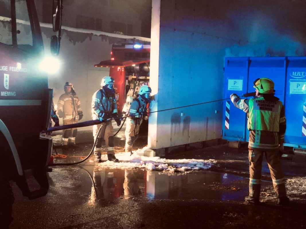 „Brand im Freien – Müllcontainer in Flammen“. So lautete die Alarmmeldung, mit welcher die FF Mieming mittels Pager am 7. Jänner um 19:47 Uhr zu einem Hotel alarmiert wurde. Nach Ankunft des Einsatzleiters stellte sich heraus, dass zirka 3,5 Tonnen Inhalt einer Kartonagenpresse in Brand gerieten. 30 Mann rückten aus und unter schwerem Atemschutz wurde der Container geöffnet. Damit der Container kräfteschonender und rascher entleert werde konnte, stellten zwei Feuerwehrkameraden, welche in unmittelbarer Nähe wohnten, ihren Hoftrac und Traktor mit Frontlader zur Verfügung. Inzwischen ist auch das Entsorgungsunternehmen eingetroffen. Mittels Hakenlift wurde der Container ins Freie gezogen und komplett entleert. Die Kartonagen wurden am Vorplatz verteilt und die Glutnester gelöscht.