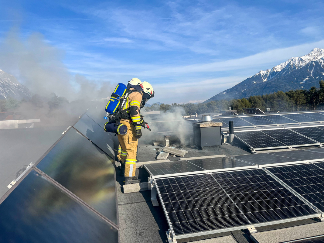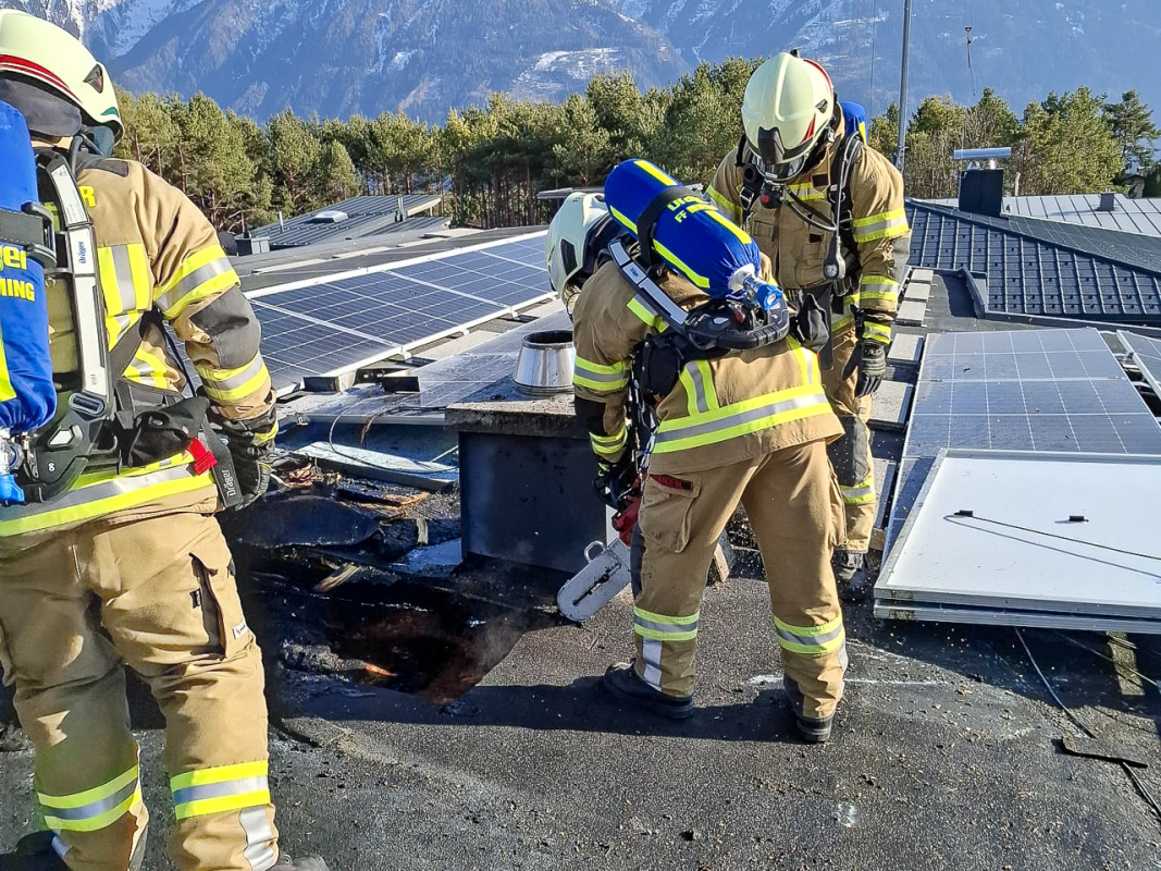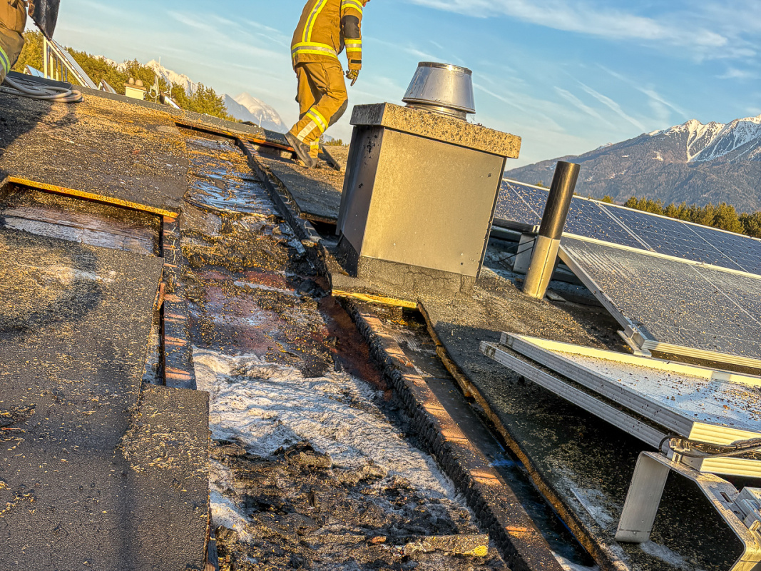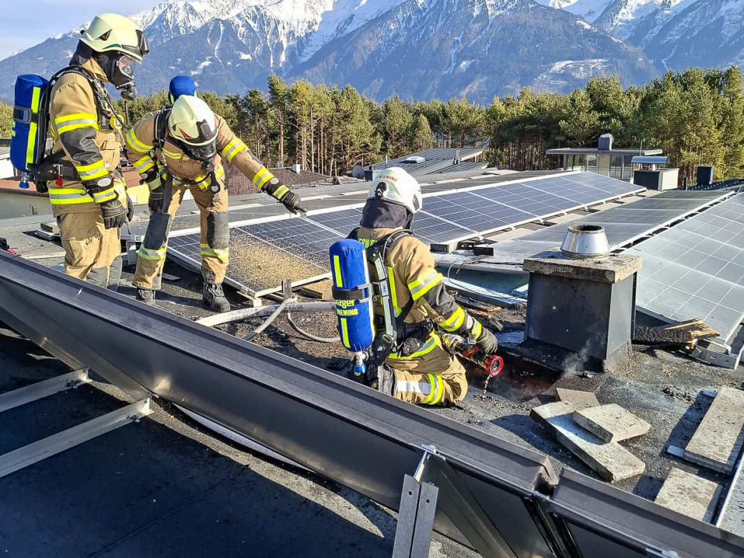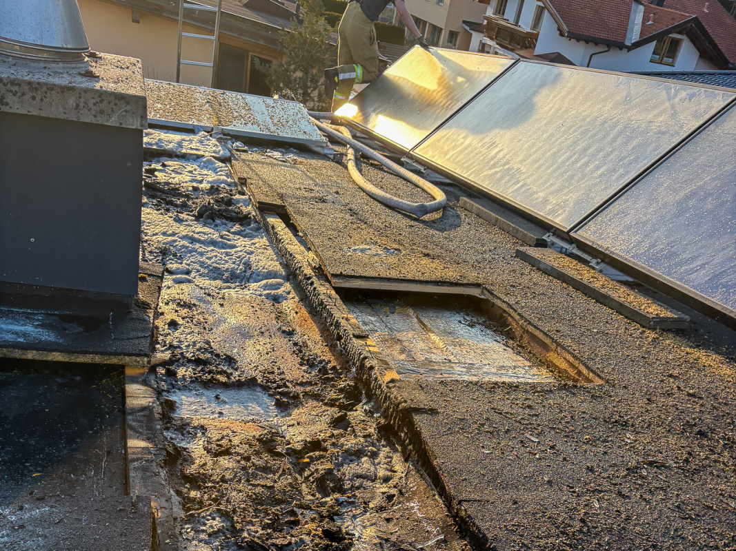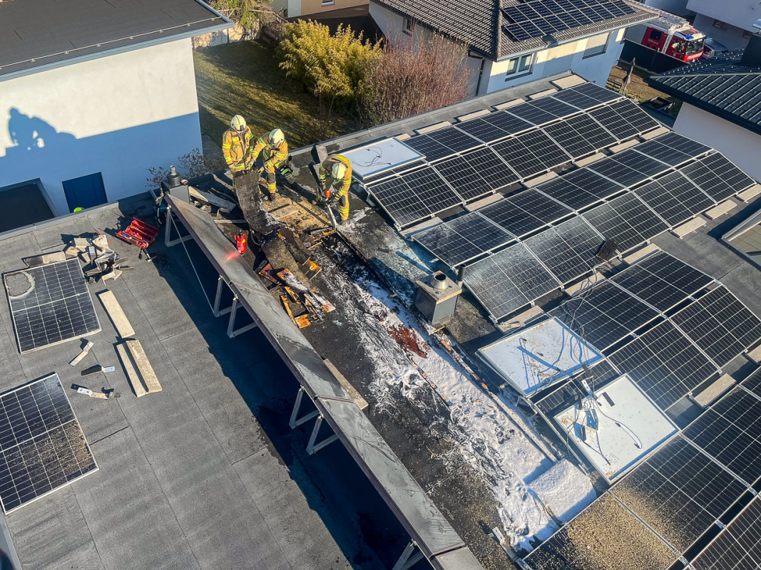 Vor Ort war an den Photovoltaikmodulen ein Brandherd sichtbar, welcher bereits auf den Dachstuhl übergegangen war. Für die Nachlöscharbeiten mussten mittels schwerem Atemschutz PV-Module entfernt und ein Teil der Dachhaut geöffnet werden.