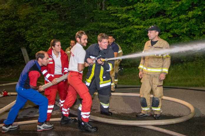 Ein besonderes Highlight für das heurige Jahr war die Tauschübung, welche heuer am 1. Juni 2023 abgehalten werden konnte. Hier war es den Mitgliedern von Feuerwehr, Rotes Kreuz und Bergrettung bei mehreren Stationen möglich, in die Tätigkeiten der anderen Einsatzorganisationen hinein zu schnuppern. So konnte man sich etwa von der Lehnbachbrücke abseilen lassen oder ein Unfallfahrzeug mit Spreizer und Bergeschere „bearbeiten“. Vom Roten Kreuz war die Sondereinsatzgruppe (SEG) aus Telfs und die SEG aus Innsbruck mit einem Großunfallfahrzeug (GUF) vor Ort, um ihre Fahrzeuge vorzustellen.