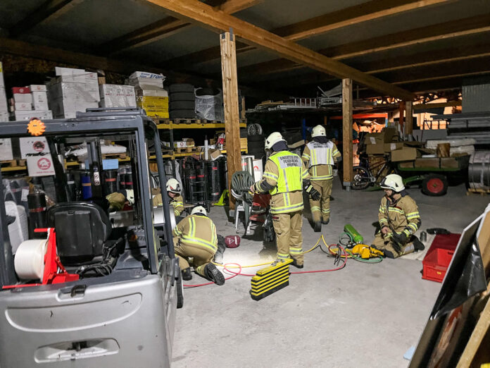 Aufgabe war einerseits die Bergung einer eingklemmten Person im Werkstattbereich und andererseits die Löschwasserversorgung aus dem nahegelegenen Bach sicherzustellen.