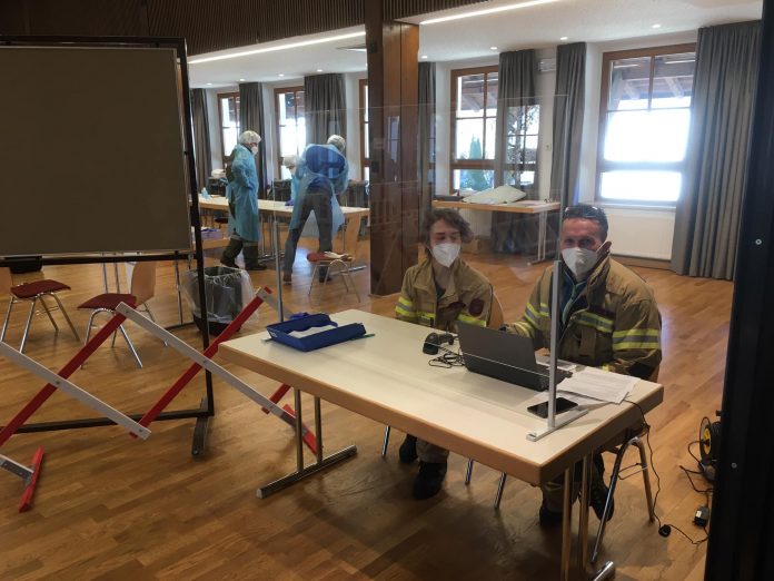 So wurde auch in Mieming unter organisatorischer Leitung der Gemeinde der Gemeindesaal in ein Testlokal umfunktioniert. An drei Stationen konnte sich die Bevölkerung mittels Antigen-Schnelltest freiwillig auf das COVID-19-Virus testen lassen. Mitglieder der Feuerwehr Mieming waren für administrative Aufgaben sowie als Unterstützung des medizinischen Personals eingeteilt. So musste die Vollständigkeit der erforderlichen Dokumente und die Identität geprüft – oder die Einhaltung der Sicherheitsauflagen überwacht werden. Hierfür wurde jeweils in zwei Schichten, 7 – 12 Uhr und 12 – 17 Uhr, im Team zu 8 Personen gearbeitet. Unterstützung erhielten wir von Mitgliedern der örtlichen Bergrettung.